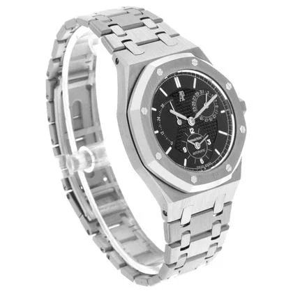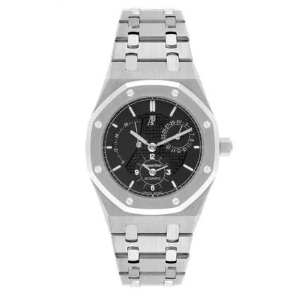 Audemars Piguet Royal Oak Dual Time Power Reserve Steel Watch 25730ST Box Papers. Automatic self-winding dual-time movement with date and power reserve functions. Stainless octagonal case 36.0 mm in diameter. Solid case back. Audemars Piguet logo on the crown. Stainless steel octagonal bezel punctuated with 8 signature screws. Scratch resistant glareproof sapphire crystal. Black dial with Grande Tapisserie waffle pattern. Luminescent baton hour markers and hands. Dual / second time zone subdial at the 6 o’clock position. Power Reserve indicator located at the top left side of the dial. Date calendar subdial at 2 o’clock. Stainless steel bracelet with a push-button folding clasp. Fits up to a 7 1/4″ wrist. Excellent condition.