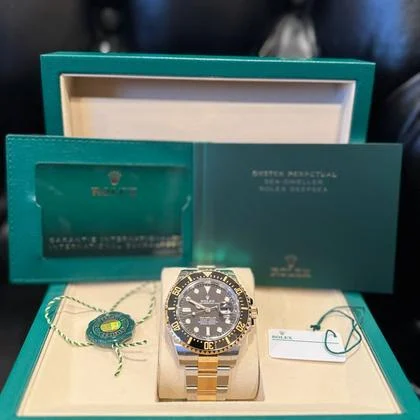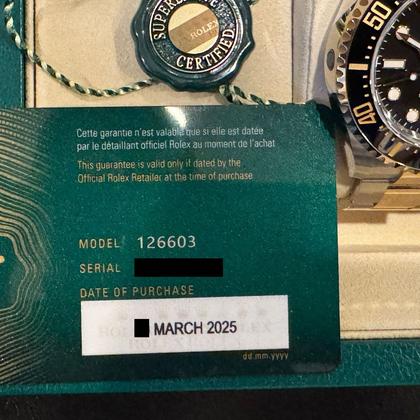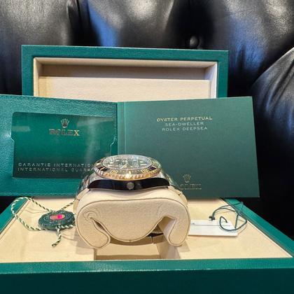 Reference Number: 126600 Year: 2025 Condition: Unworn, mint condition Scope of Delivery: Full set with original box, warranty card (dated 2025), manuals, tags, and all links. Specifications:Case: 43mm stainless steel Dial: Black with luminous markers Movement: Automatic, Calibre 3235 with 70-hour power reserve Crystal: Scratch-resistant sapphire with Cyclops lens over date Bracelet: Oyster, stainless steel with Glidelock clasp Water Resistance: 1,220 meters (4,000 feet) Features: Helium escape valve, unidirectional ceramic bezel, date function with Cyclops magnification. Purchased from an authorized Rolex dealer in March 2025 , this Sea-Dweller has never been worn . The watch comes with all original documentation, including a warranty card dated 2025, ensuring Rolex’s 5-year warranty. |